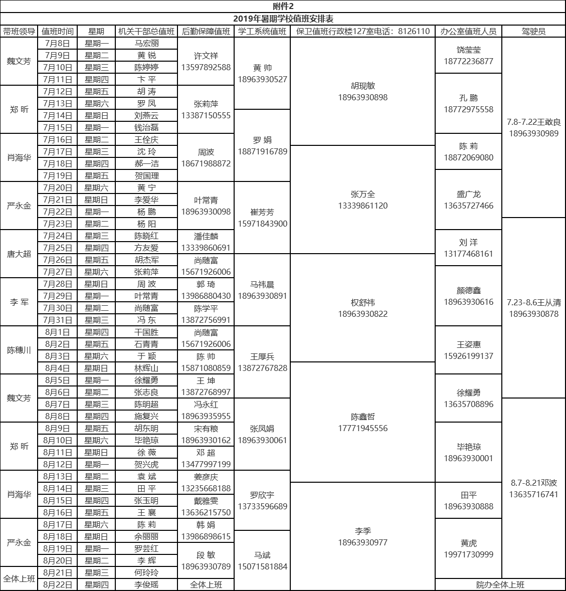 暑期仍然有诸多工作要完成,请各部门做好相关安排;注意相关纪律,注意出行安全。各部门、各岗位及学校总值班人员,必须按上级应急值班和学校值班相关规定,坚守岗位,确保信息畅通,处理应急事务,及时报告重大事项,切实维护校园稳定安全。学校中层及以上干部离开十堰必须向主管领导请假并向校办报备,保持手机畅通,保证有紧急任务时能及时到校。